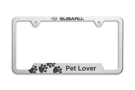 At Subaru, pets are part of the family. Share your love for your furry, scaly or feathered friends with our Pet Lover License Plate Frame. Subaru Pet Lover frames are manufactured from heavy-gauge 304 stainless steel that will not rust or corrode, and come in either matte black or polished stainless steel.